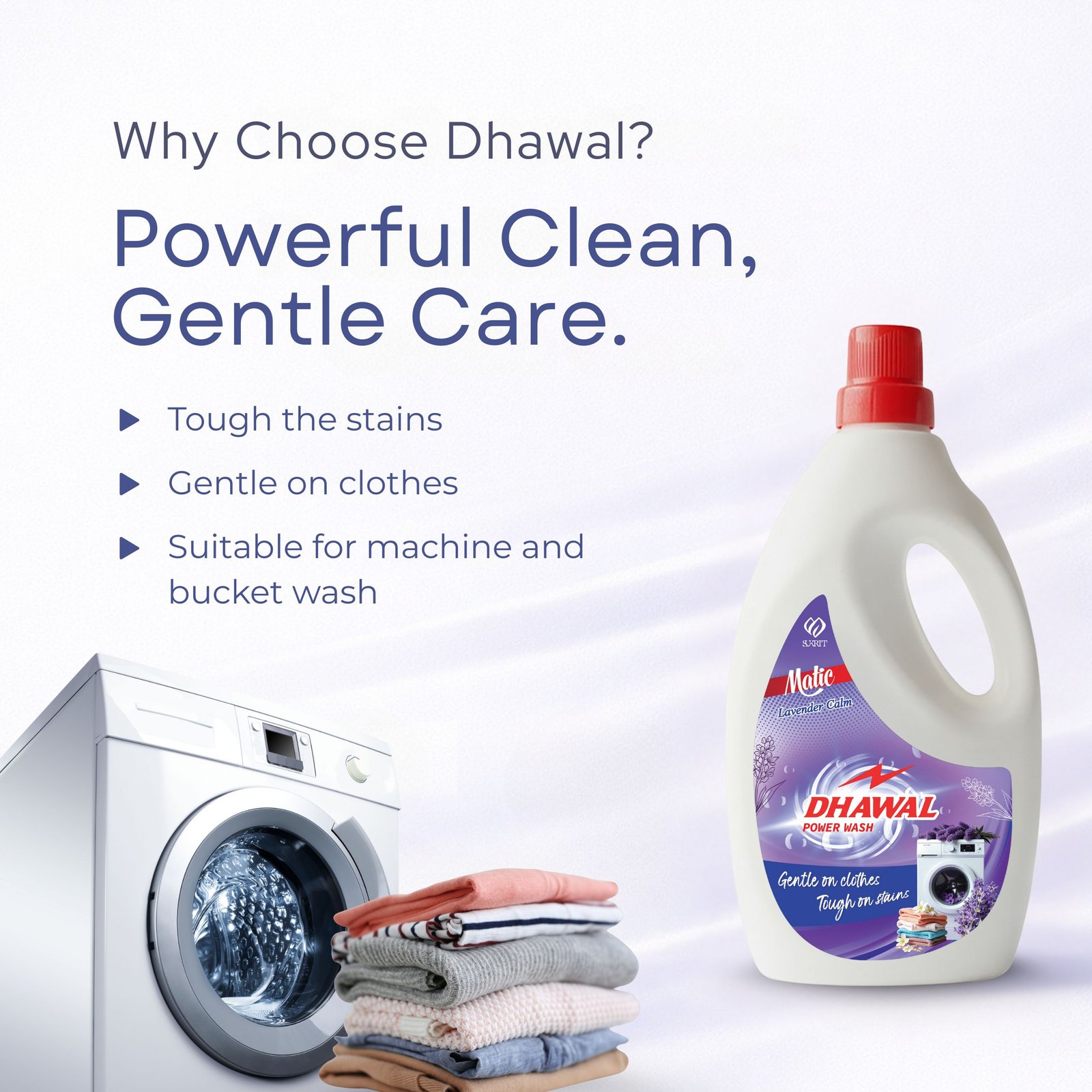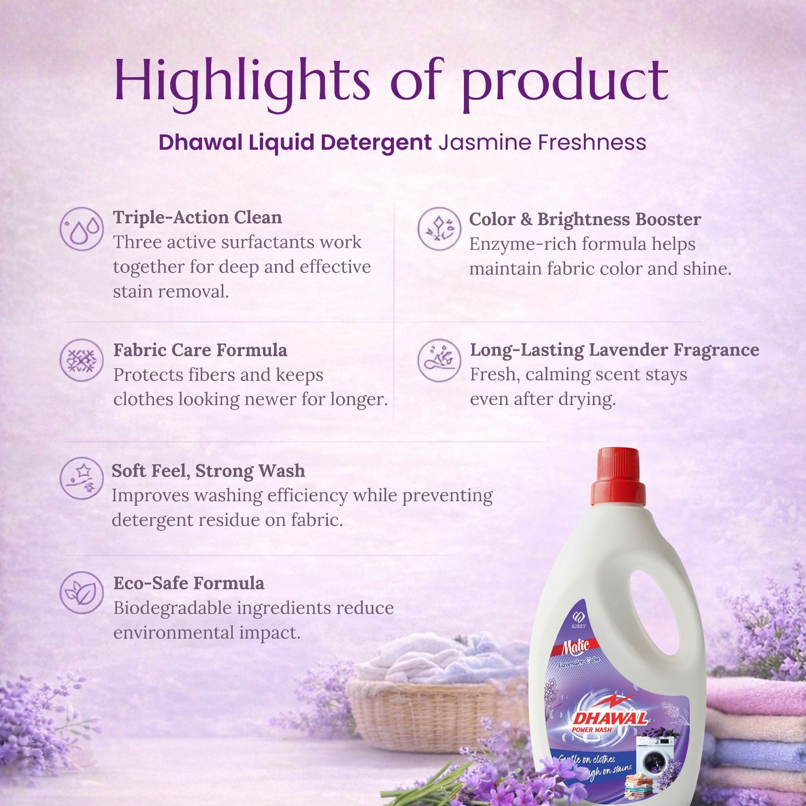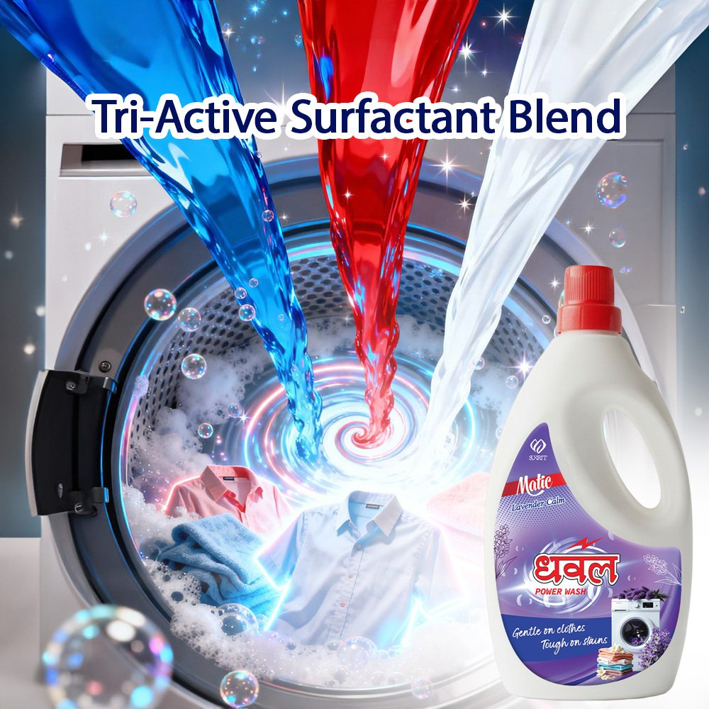 Dhawal Liquid Detergent (Lavender Calm) is a perfect blend of science and care — powerful enough to remove the toughest stains yet gentle enough to protect your favorite clothes. Its advanced multi-action formula cleans, brightens, and preserves fabric softness while leaving behind a calming lavender fragrance that soothes the senses. Enjoy a premium, refreshing wash every time you use it.